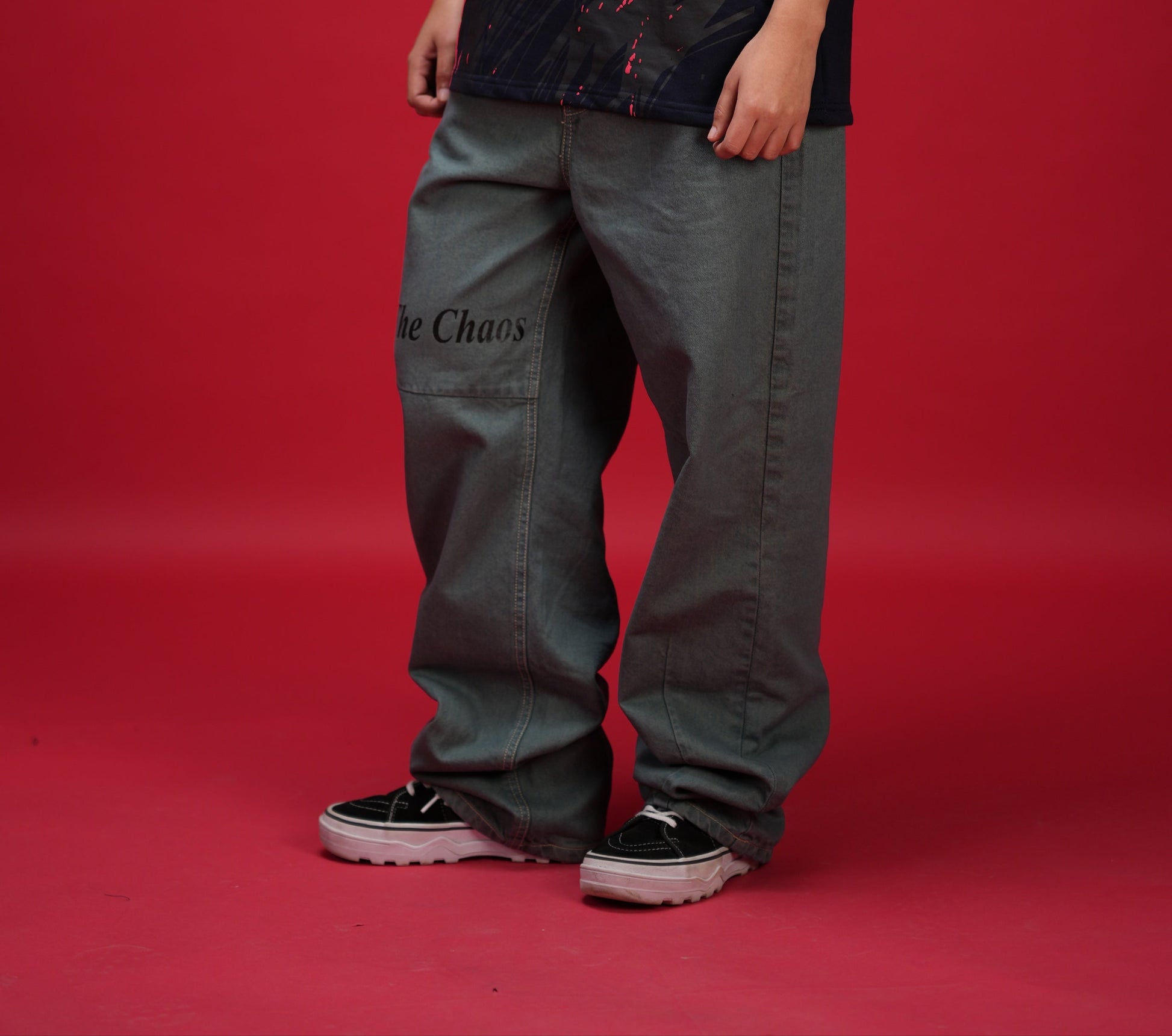 Mid waist, baggy thigh, dropped crotch, straight leg 14 oz jeans designed for comfort with an effortless oversized fit. Own The Chaos boldly printed above the knee, making a statement with every step. Spy logo on the back pocket, a subtle flex that speaks for itself.